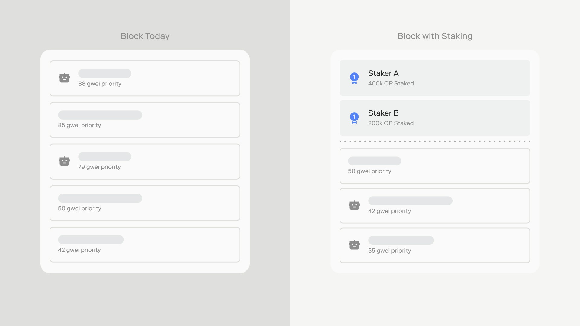 Every address that stakes 100,000 OP becomes eligible for top-of-block positioning. Within this tier, ordering is strictly first-in, first-out — no amount of extra stake changes your position. Everyone who meets the threshold is on equal footing. All non-staking transactions continue to be ordered by the existing priority gas auction. Nothing changes for users who aren't participating.