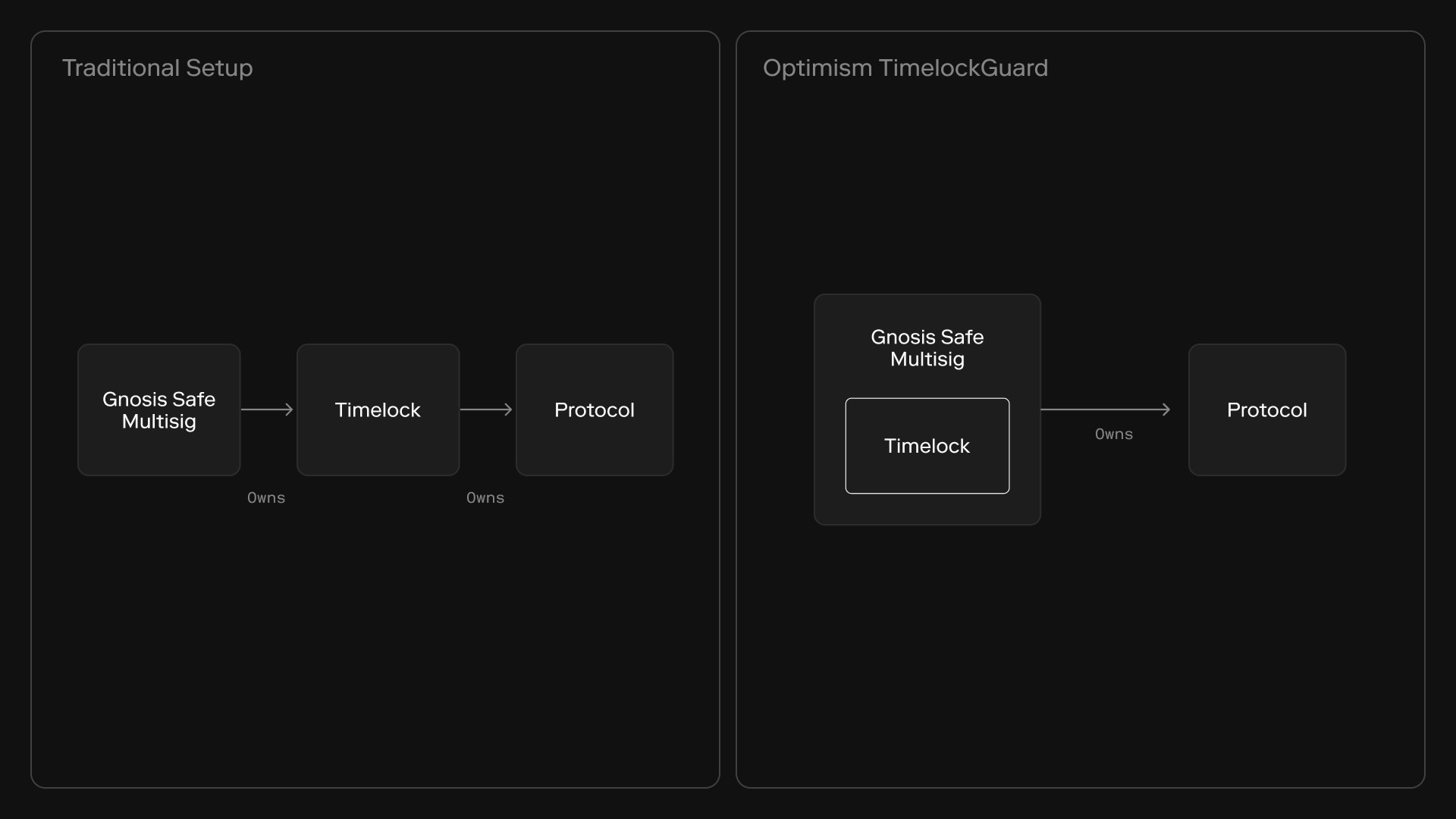 At Optimism, we implemented a timelock that integrates closely with Gnosis Safes and demands the minimal possible variation on existing governance processes. By reusing code from the Safe that it integrates with, the timelock becomes much simpler and more robust.